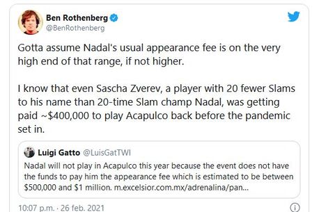Ben Rothenberg, ziarist la New York Times, a dezvăluit și el cât încasează Alexander Zverev în asemenea situații: 400.000 de dolari. Vedeta a precizat că avea deja un contract semnat cu gazdele turneului de pe pământ mexican. Competiția de la Acapulco e dotată cu premii în valoare totală de un milion de dolari