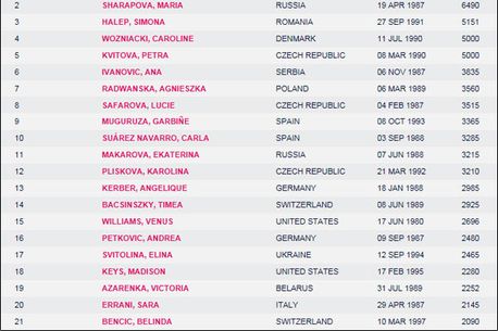 34 de ani, cea mai vârstnică jucătoare care ocupă primul loc în clasamentul WTA. Serena Williams a doborât vechiul record încă de la jumătatea lunii iunie, când se afla pe locul 1 WTA la 33 de ani și 267 de zile.