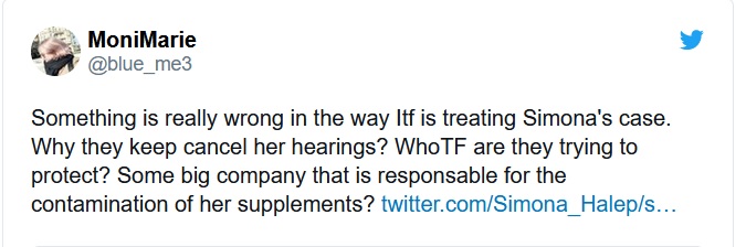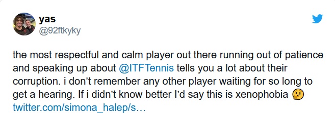 „Cea mai respectuoasă și calmă jucătoare din tenis își pierde răbdarea și vorbește despre ITF. Asta spune multe despre corupția lor. Nu-mi amintesc niciun alt jucător care să fi așteptat atât de mult timp pentru a fi audiat. Dacă nu aș ști mai bine, aș spune că este vorba de xenofobie”, a comentat un alt susținător al Simonei, pe Twitter.