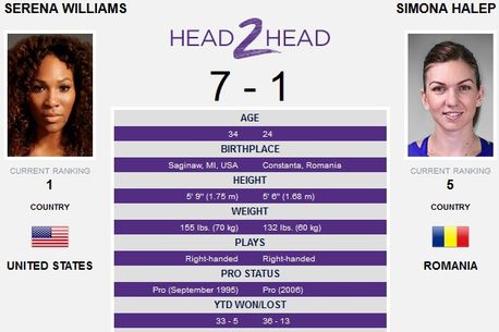 Simona se află în fața unei mari provocări, încercând să o învingă pentru prima oară într-un meci eliminatoriu pe Serena! Constănțeanca e condusă de Williams cu 7-1 în meciurile directe, singura victorie fiind obținută de Halep în grupele Turneului Campioanelor de la Singapore, ediția 2014, scor 6-0, 6-2. Cu excepția partidei disputate în urmă cu doi ani, liderul mondial a dominat toate meciurile cu Simona, ultimele trei dueluri fiind câștigate de Serena chiar pe tărâm american: 6-2, 4-6, 7-5 în semifinale la Miami 2015, 6-3, 7-6(5) în finală la Cincinnati 2015 și 6-4, 6-3 în sferturi la Indian Wells 2016.