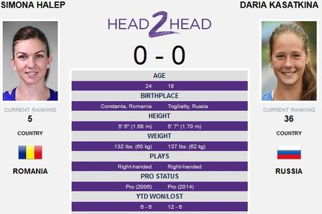 UPDATE 01:20 Remember | Să dăm timpul înapoi cu un an și să ne amintim unde se aflau cele două jucătoare la acea vreme. Daria Kasatkina era o anonimă aflată pe locul 260 WTA și juca în calificări la BRD Bucharest Open, acolo unde se duela cu o altă româncă, Cristina Ene (locul 485 WTA). Rusoaica se impunea cu 6-1, 6-2. De partea cealaltă, Simona Halep era în prim-planul tenisului mondial, câștigând turneul Premier Mandatory de la Indian Wells (2-6, 7-5, 6-4 în finală cu Jelena Jankovic).