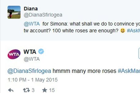 Un moment amuzant s-a consumat atunci când jucătoarei în vârstă de 23 de ani i s-a făcut o propunere ieșită din comun, din partea unei fane pe nume Diana: „Ce trebuie să fac pentru a te convinge să îți folosești contul de Twitter? 100 de trandafiri albi sunt de ajuns”? Simona nu s-a arătat impresionată. „Hmmm… nu sunt de ajuns, vreau mai mulți trandafiri”, a replicat ea, gândindu-se probabil la ce pericole ar aștepta-o pe respectiva rețea de socializare, cum ar fi și Jesper Andreassen, danezul obsedat care i-a trimis mesaje de amenințare.