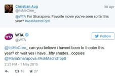 Maria Șarapova, campioana en-titre, a încheiat sesiunea de întrebări dezvăluind că nu prea merge la film, dar că anul acesta a urmărit pelicula „Fifty Shades of Grey”, cu Dakota Johnson și Jamie Dornan în rolurile principale.