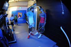 Aici poți vedea cum elvețianul și bielorusa au lovit mingea ținându-se de mână, în timp ce Nadal se amuza copios