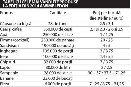 Wimbledon, al treilea Grand Slam din calendar și cel mai vechi turneu de tenis din lume, este și o uriașă fabrică de făcut bani. Iarba uniformizată la 8 milimetri găzduiește meciuri încântătoare și dramatice, dar farmecul nu este generat numai de spectacolul sportiv. O tradiție culinară care a fost împământenită la „All England Club”, complexul de la Wimbledon, generează profituri gigantice. Cumpărăturile efectuate de 486.898 de spectatori care urmăresc tenis de la fața locului în cele 13 zile de concurs le oferă organizatorilor, de asemenea, o sursă importantă în acoperirea premiilor-record pe plan mondial. Și din porțiile de mâncare și din paharele de băutură se strâng o parte din cele 25 de milioane de lire sterline (31 de milioane de euro) pentru recompensele totale acordate jucătorilor (dintre care 1,76 milioane de lire sterline, echivalentul a 2,2 milioane euro, este premiul pentru campionii de la simplu).
