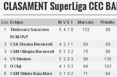 Etapa a cincea a SuperLigii CEC Bank la rugby a programat sâmbătă doar două întâlniri, partida Steaua – Baia Mare urmând să se dispute în octombrie, pentru că maramureșenii pregătesc returul din barajul Challenge Cup cu Enisei Krasnoiarsk, din Rusia (joc programat pe 2 mai).