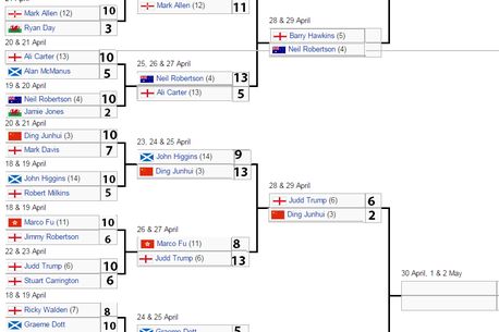 Dacă în optimea cu John Higgins, chinezul Ding a revenit spectaculos de la 5-1 pentru a câștiga cu 13-9, șansele ca el să mai poată face ceva în sfertul cu Judd Trump sunt minime. Prima sesiune a meciului i-a adus totul lui Trump: bile introduse în buzunar prin lovituri superbe de distanță, ieșiri excelente la bilele colorate, lovituri de siguranță care l-au pus în dificultate pe chinez și, evident, puțin noroc. Din nou, chinezul a etalat un joc inconstant, inclusiv un potențial break maxim care s-a oprit la a șaptea bilă roșie și i-a pus frame-ul pe tavă lui Trump.