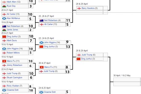 În schimb, Trump a etalat din nou un snooker bun, mult peste medie, dar a avut momente de deconcentrare. Totuși, cu break-uri de 59 și 133 de puncte, ultimul fiind și cel mai mare al său de la acest Mondial, Trump a câștigat cu 13-8 și va juca în sferturi cu Ding Junhui în ceea ce va fi, probabil, cel mai echilibrat meci din această fază.