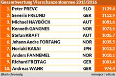 Per total, Peter Prevc s-a impus în Turneul celor patru trambuline cu trei victorii de etapă: a început cu un loc trei, la Obersdorf, apoi slovenul a câștigat prima sa etapă în „4 Hills”, la Garmisch-Partenkirchen, continuând seria cu victorii la Innsbruck și Bischofshofen. Avantajul său: 26,9 puncte în fața germanului Severin Freund, câștigător al primei etape a competiției dintre ani.