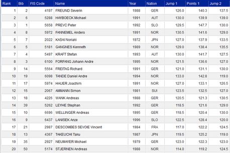 Freund a tranșat duelul în manșa a doua, recuperând un deficit de 7,4 puncte puse în față de slovenul Peter Prevc după prima rundă de sărituri, grație unei încercări de 129,5 m – cu 3,5 metri mai lungă decât a germanului. De la 126 de metri săriți în prima manșă, Freund a ridicat ștacheta la 137,5 metri, în manșa a doua. Austriacul Michael Hayboeck a fost singurul care a reușit un zbor mai lung decât campionul mondial, de 139 m, însă acesta a fost suficient doar pentru locul doi. Germania sărbătorește astfel primul succes al unui sportiv local după 2002, atunci când Sven Hannawald se impunea la Oberstdorf.