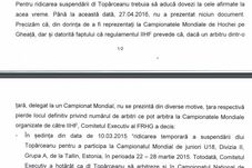 „Începând cu martie 2015 am fost suspendat de trei ori de către Biroul Federal al FRHG din activitatea hocheistică, pentru aceleași fapte și de fiecare dată în același mod: fără ca măcar să mi se comunice decizia de suspendare, fără să mă treacă prin comisiile disciplinare, fără să știu care sunt faptele de care sunt acuzat, fără a putea să-mi exercit dreptul la apărare. Mi s-a impus o suspendare a cărei limită (3 ani) depășește maximul permis de regulament (1 an) și mi s-a interzis să particip la orice activitate hocheistică. De fiecare dată când a fost nevoie de mine (la Campionatele Mondiale, în campionatul național) Comitetul Executiv mi-a ridicat suspendarea, cât să arbitrez, ca apoi să aflu „pe surse” ca sunt din nou suspendat de către Biroul Federal. Sunt singurul arbitru român care s-a întors de la Mondiale consecutiv cu două săgeți în sus, ceea ce arată performanța mea sportivă, am arbitrat impecabil finala Cupei României, toate meciurile de play-off din cadrul campionatului și nu am avut nicio abatere sau greșeală. Tot „pe surse” am aflat că motivul suspendării mele este o declarație pe care am făcut-o pe profilul personal de Facebook referitor la modul dubios în care s-au desfășurat două meciuri din Campionatul Național. Ori, suspendarea pentru astfel de declarații nici măcar nu e posibilă conform regulamentelor! Am de gând să contest aceste acțiuni neregulamentare ale Biroului Federal folosind toate căile de atac disponibile, inclusiv în instanțele românești și internaționale, dacă e cazul. Consider că articolul de regulament în baza căruia am fost suspendat este contrar Legii 69/2000 a educației fizice și sportului și statutului IIHF, întrucât acordă Biroului Federal drept de control absolut asupra corpului arbitrilor și oricărui proces disciplinar. Acest lucru este inaceptabil”, au fost declarațiile arbitrului suspendat.