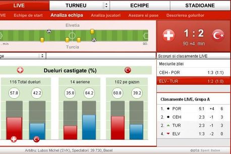 Aseară, înfruntării i s-a mai adăugat o miză. Echipa care a avea să piardă urma să părăsească întrecerea. Turcii "împăratului" Terim, mai experimentați și foarte bine așezați pe teren, au obținut dreptul de a se bate cu Cehia pentru un loc în faza sferturilor de finală. Elvețienii lui Koebi Kuhn au părăsit competiția după un joc de apreciat, au avut inițiativa, au presat, uneori și-au sufocat adversarul și la scorul de 1-1 au ratat cel puțin două ocazii uriașe. Nu au reușit să le fructifice, mai rău chiar, au pierdut în final, la una dintre ultimele faze ale partidei. Să vedem ce spun cifrele. Disperarea elvețienilor se reflectă perfect în șuturile expediate către poarta lui Volkan, 17 la număr, față de numai 9 ale otomanilor. Ambele echipe au jucat mai mult în jumătatea adversă, perioada de posesie a balonului fiind sensibil egală, 50,5 % pentru turci, 49,5% pentru elvețieni. Jucătorii bătrânului Koebi Kuhn au câștigat majoritatea duelurilor din teren, 60 % dintre cele pe gazon și 57 % din totalul celor 116. Tuncay și compania au fost superiori doar la duelurile aeriene, 64% câștigate. Pentru turci, replica cehilor se anunță a fi mult mai tăioasă.