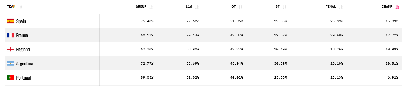 Supercalculatorul OPTA o vede favorită pe Spania cu o probabilitate de 15.83% șanse. Pe locul secund este Franța, cu o probabilitate de 12.77%, în timp ce pe locurile 3 și 4 sunt Anglia și Argentina, cu o probabilitate de 10.99% și 10.51%. Top 5 e completat de naționala altei legende, Cristiano Ronaldo. Portugalia e cotată cu 6.92% șanse să dea lovitura în SUA.