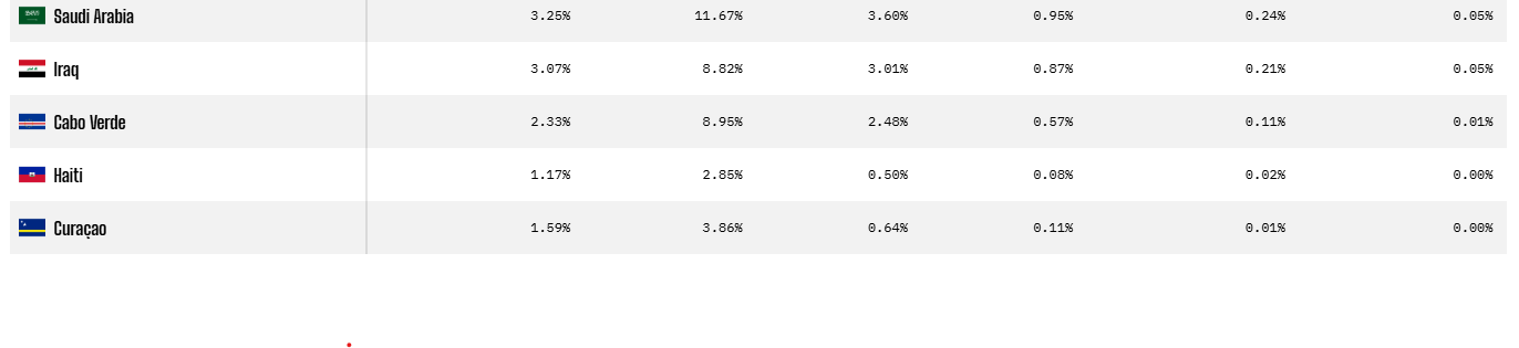 Există și echipe cu 0.00% șanse la câștigarea titlului. Calculatorul OPTA nu crede în minuni când vine vorba de naționalele din Curacao sau Haiti.