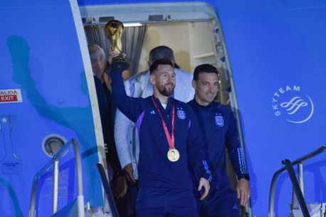 Argentina's captain and forward Lionel Messi (C) holds the FIFA World Cup Trophy upon arrival at Ezeiza International Airport after winning the Qatar 2022 World Cup tournament in Ezeiza, Buenos Aires province, Argentina on December 20, 2022.,Image: 745727164, License: Rights-managed, Restrictions: , Model Release: no