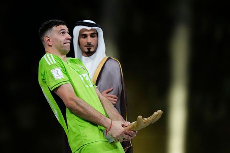 Emiliano Martinez goalkeeper of Argentina and Aston Villa whit his trophy of Best Goalkeeper after the FIFA World Cup Qatar 2022 Final match between Argentina and France at Lusail Stadium on December 18, 2022 in Lusail City, Qatar. Argentina v France: Final - FIFA World Cup Qatar 2022, Lusail City - 18 Dec 2022,Image: 745423785, License: Rights-managed, Restrictions: RESTRICTED TO EDITORIAL USE, Model Release: no