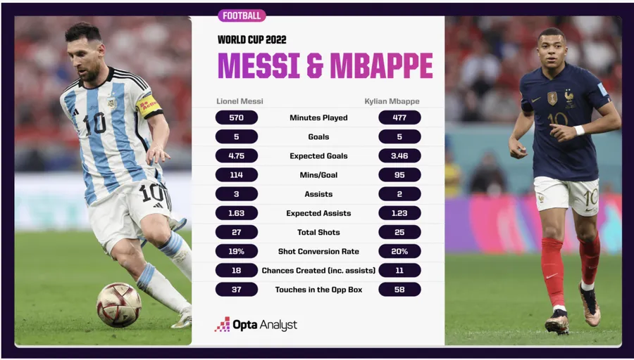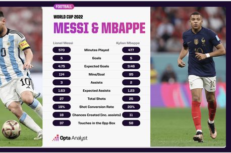 Cei de la Opta Analyst au realizat un tabel în care sunt prezentate în detaliu statisticile lui Messi și Mbappe la acest turneu final, iar cu toate că francezul are un gol marcat la aproximativ 95 de minute, spre deosebire de Messi, care a înscris argentinian la 114 minute, Messi și-a creat mult mai multe oportunități (4.75 xG, față de 3.46).