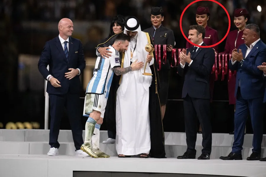 Adriana Paul a purtat uniforma vișinie a companiei aeriene pentru care lucrează, iar ea a fost cea a ținut trofeul pentru cel mai bun jucător de la Campionatul Mondial, care a ajuns la Leo Messi.
