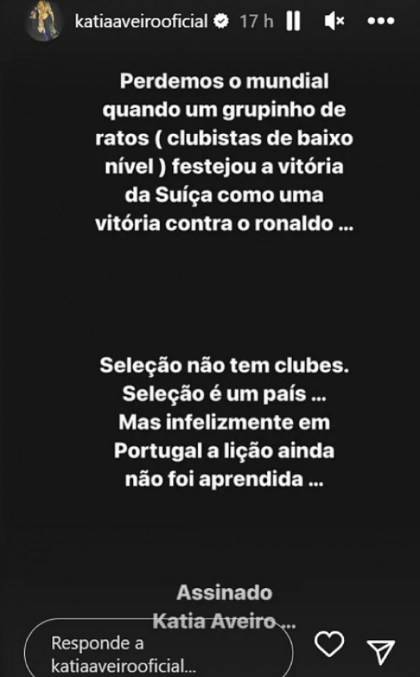 „Am fost eliminați de la Cupa Mondială când un grup de șobolani (de la cluburi de mâna a doua) au celebrat victoria împotriva Elveției ca pe o victorie împotriva lui Ronaldo. Echipa națională reprezintă o țară întreagă. Din păcate, Portugalia nu a învățat această lecție”, a scris Katia Aveiro, pe Instagram.