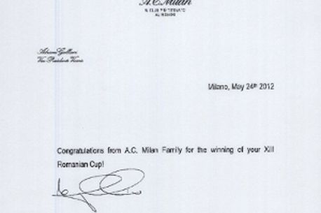 „Felicitări din partea familei AC Milan”, este mesajul clubului italian, semnat de vicepreședintele Adriano Galliani (foto).