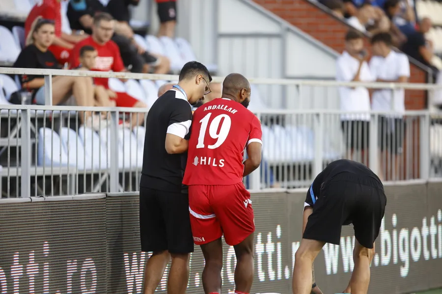 În minutul „ghinionist” 13, Dinamo și-a pierdut unul dintre cei mai în formă jucători ai momentului, Hakim Abdallah. Acesta a încercat o incursiune pe dreapta, dar a fost contrat de Andreș. Atacantul „câinilor” a vrut să se rostoglească peste umărul drept, dar a căzut greșit și s-a accidentat.
