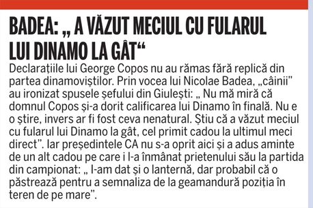 Aflat pe litoral pentru a pregăti deschiderea sezonului estival, boss-ul de la Ana a continuat atacul la adresa echipei despre care se spune că a simpatizat-o în tinerețe: „Spre deosebire de meciul din campionat, aici va fi cu totul altceva. Altă încărcătură, altă miză, deci nu putem vorbi despre o revanșă după egalul din Giulești. În schimb, trebuie precizat că fotbalul a fost nedrept cu cei de la Gaz Metan. Dinamo nu merita să ajungă în finală. Gazul a jucat foarte bine atât la București, cât și la Mediaș, mult peste adversarul lor. Așa că mă bucur că o să jucăm cu cei de la Dinamo”, a declarat George Copos.