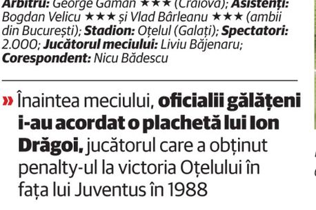Rivalitatea dintre muntenii din Brăila și moldovenii din Galați, cele două orașe care împart ultimii kilometri ai Dunării, a trăit doar un minut aseară. Ciocâlteu întoarce un adversar, șutează, dar Brăneț respinge. Atât. Odată bătut gongul după primele 60 de secunde, gălățenii trec la atac. Presează, presează, dar vecinii încă nu deschid culoarele. E nevoie de greșeala lui Spiridon la o minge infiltrată inteligent de Pena printre fundașii adverși, iar Băjenaru driblează portarul și marchează (24). Tot mijlocașul trecut la un moment și pe la Steaua creează și următoarea fază. Driblează cu stil un adversar, aruncă mingea spre fruntea lui Viglinati, dar argentinianul nimerește punctul unde barele se unesc (30). La fel face și Neagu, dar cu stâlpul din dreapta lui