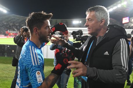 Laszlo Dioszegi il felicita pe Roland Csaba Niczuly dupa meciul de fotbal dintre Sepsi OSK Sfantu Gheorghe si Universitatea Cluj, finala Cupei Romaniei, desfasurat pe Stadionul Municipal din Sibiu, miercuri 24 mai 2023. © FOTO:Razvan Pasarica/SPORT PICTURES