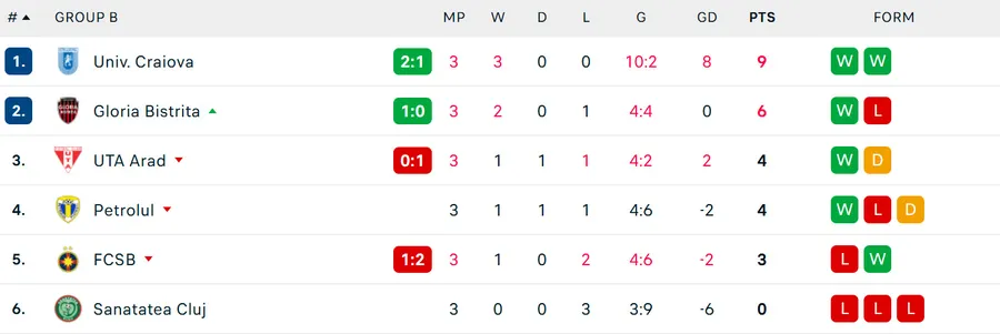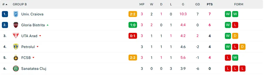Gloria Bistrița este singura echipă care mai are șanse matematice să se califice în sferturi. Pentru asta trebuie să învingă UTA de la 20:30, iar FCSB să nu plece victorioasă de la Craiova.