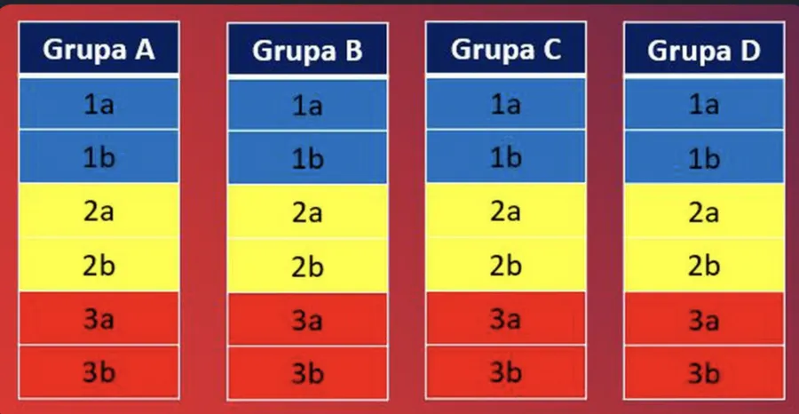 Pentru fiecare grupă în parte, primei echipe extrase din urna valorică 1, respectiv 2 i se va atribui denumirea generică «1a», respectiv «2a», iar cea de-a două extrasă va primi denumirea de «1b» și «2b». În același timp, echipele din urna valorică 3, deja împărțite în grupe, vor primi prin tragere la sorți denumirea generică «3a» și «3b».
