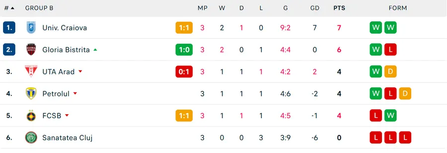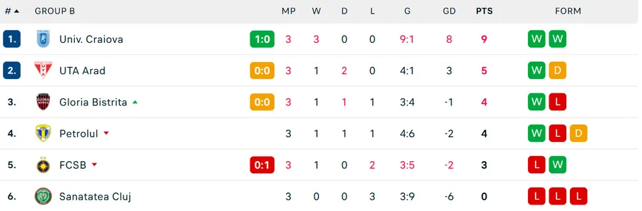 Gloria Bistrița este singura echipă care mai are șanse matematice să se califice în sferturi. Pentru asta trebuie să învingă UTA de la 20:30, iar FCSB să nu plece victorioasă de la Craiova.