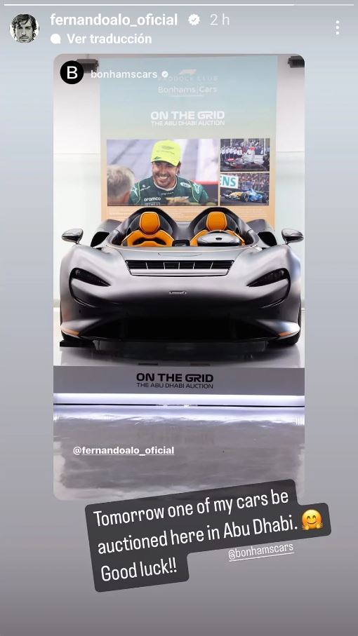 „Mâine (n.r. – sâmbătă), una dintre mașinile mele va fi scoasă la licitație în Abu Dhabi. Mult succes tuturor!”, a scris Fernando Alonso, într-un Insta Story.