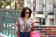 Romina Ferrari și-a făcut apariția într-o bluză animal-print, în care bustul generos i-a ieșit în evidență, pe care a asortat-o cu o fustă de blugi, ochelari de soare, iar ca accesoriu a folosit o poșetă roșie. În timp ce mergea pe strările Capitalei, românca și-a folosit în permanență telefonul.