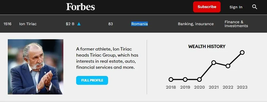 Ion Țiriac e românul cu cea mai mare avere. Magnatul se află acum pe locul 1516 în Topul Forbes, după ce a cunoscut o urcare în clasamentul mondial de circa 300 de locuri.