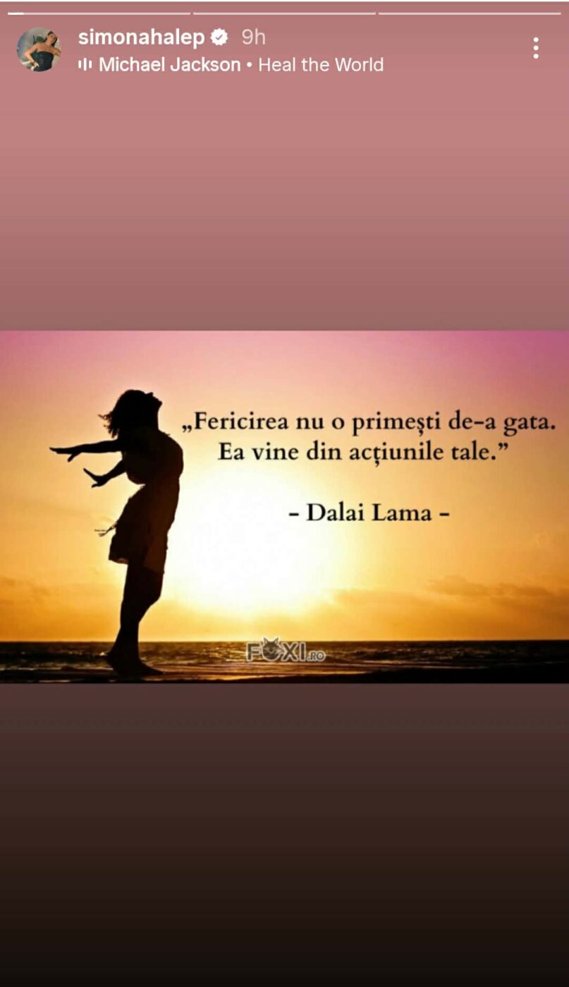 Mesajul notat? Femeia a utilizat un citat care îi aparține lui Dalai Lama, pentru a exprima ceea ce simte. „Fericirea nu o primești de-a gata. Ea vine din acțiunile tale”, se arată pe contul de Instagram al fostei tenismene.