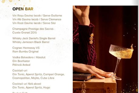Open Bar-ul conține vin roșu Davino Iacob / Serve Guillame, vin alb Davino Iacob / Serve Clemance, vin Roze Davino Iacob / Serve Sisi, Champagne Prestige des Sacres, Cuvee Grenat 2015, Whisky Jack Daniel‘s single Barrel, Whisky Jameson Black Barrel, Cognac Hennessy, Rom Bumbu Original, Vodka Belvedere / Absolut, Gin Beefeater și pălincă din Ardeal.