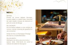 Meniul este cu totul special și cuprinde antreu, fel de bază I și del de bază II. Antreul conține gravlax de somon sălbatic Norvegia, coșuleț umplut cu salată frisee, maioneză de cază, wasabi, mouse de edamame și perle de caviar de Beluga.