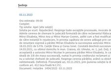 Constată deschisă succesiunea autorului Mitroi Nicolae, decedat la data de 14.03.2021, cu ultimul domiciliu în mun. Craiova, str. Ulmului, nr. 1, jud. Dolj. Constată calitatea de moştenitoare legală acceptantă a autorului Mitroi Nicolae în persoana pârâtei Mitroi Elisabeta, în calitate de fiică a defunctului, cu o cotă-parte ideală de 3/8 din masa succesorală, numai în privinţa creditorului reclamant şi în limita creanţei acestuia. Ia act că reclamantul nu a solicitat cheltuieli de judecată. Respinge cererea pârâţilor, având ca obiect acordarea cheltuielilor de judecată, ca neîntemeiată. Definitivă.