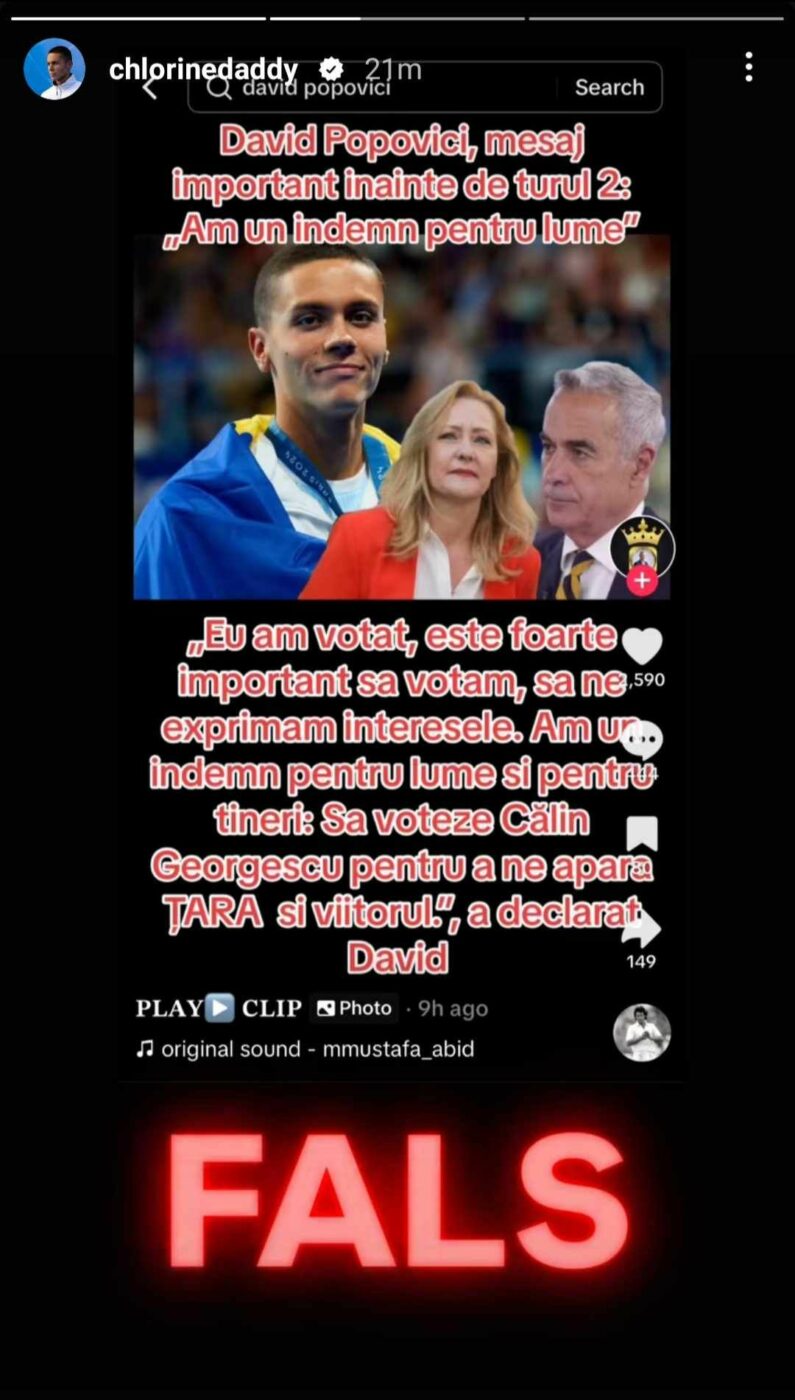 Dar, pe rețelele sociale a apărut o variantă care ar da de înțeles că Popovici îl susține pe Georgescu, ceea ce este fals, așa cum a anunțat campionul olimpic. „David Popovici, mesaj important înainte de turul 2: „Am un îndem pentru lume. Eu am votat, este foarte important să votăm, să ne exprimăm interesele. Am un îndemn pentru lume și pentru tineri: să voteze Călin Georgescu pentru a ne apăra țara și viitorul” suna „declarația” lui David Popovici! Înotătorul a notat cu majuscule cuvântul „FALS” în dreptul a ceea ce se voia a fi afirmația campionului de la JO Paris 2024.