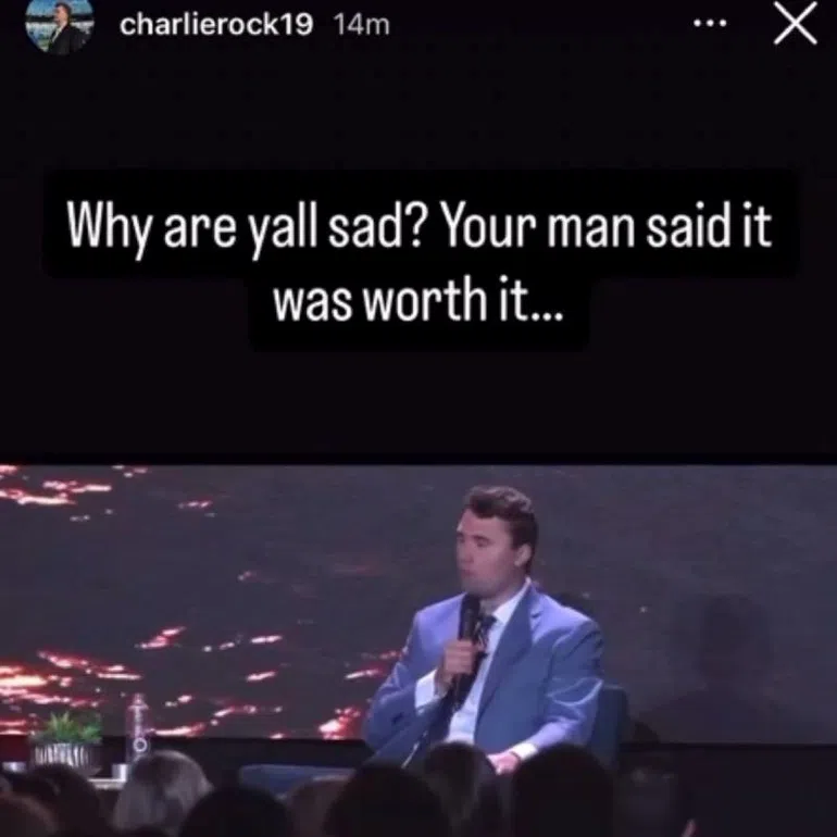 „De ce sunteți toți așa de triști? Chiar omul vostru a spus că a meritat”, a spus Charlie Rock, pe Instagram. Mesajul vine ca o contrapărere la cea a lui Kirk, care avea un punct de vedere pro-liberalizare a armelor în Statele Unite ale Americii.