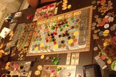 Patru prieteni joacă „Terra Mystica” într-un local care pune la dispoziție clienților o plajă largă de boardgame-uri