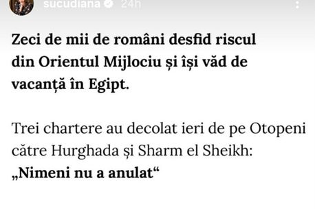Astfel, soția patronului de la Rapid București a făcut o postare pe contul personal de Instagram, prin care a încercat să evidențieze, cu ajutorul unui articol de presă, că oamenii nu sunt dispuși să renunțe la concediile pe care le au programate, indiferent de riscurile la care se expun. Totodată, postarea făcută de Diana Șucu pe rețelele de socializare îi îndeamnă pe români să fie responsabili și să cântărească foarte bine deciziile pe care le iau, având în vedere situația existentă în acest moment în Orientul Mijlociu.
