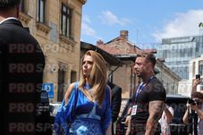 Fostul internațional român a purtat un sacou la două rânduri, cu nasturi auriți. A asortat la piept un trandafir de culoare roșie, ce simbolizează iubirea. Soția sa a avut o ținută asemănătoare cromatic. A purtat o rochie în nuanțe de bleu cu alb.