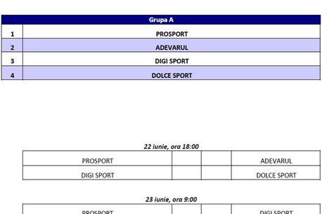 Cupa Presei la fotbal revine! Una dintre cele mai vechi competitii de fotbal amator din Romania se va disputain cadrul Romanian Corporate Sports. Prima editie a Cupei Presei Romanian Corporate Sports va avea loc in acest week-end si va aduna opt echipe la startul ei: Adevarul, Digi Sport, Dolce Sport, Gazeta Sporturilor, Antena Group, ProSport, Cancan Media si Mediafax & Friends. Echipele vor fi impartite in doua grupe a cate patru si vor disputa meciurile in tip turneu (fiecare cu fiecare). Primele doua clasate se califica in Semifinale. Pe 19 iunie, a avut loc tragerea la sorti, la sediul MPG, iar echipele au fost impartite in cele doua grupe. Mai jos, aveti componenta lor si programul competitiei: