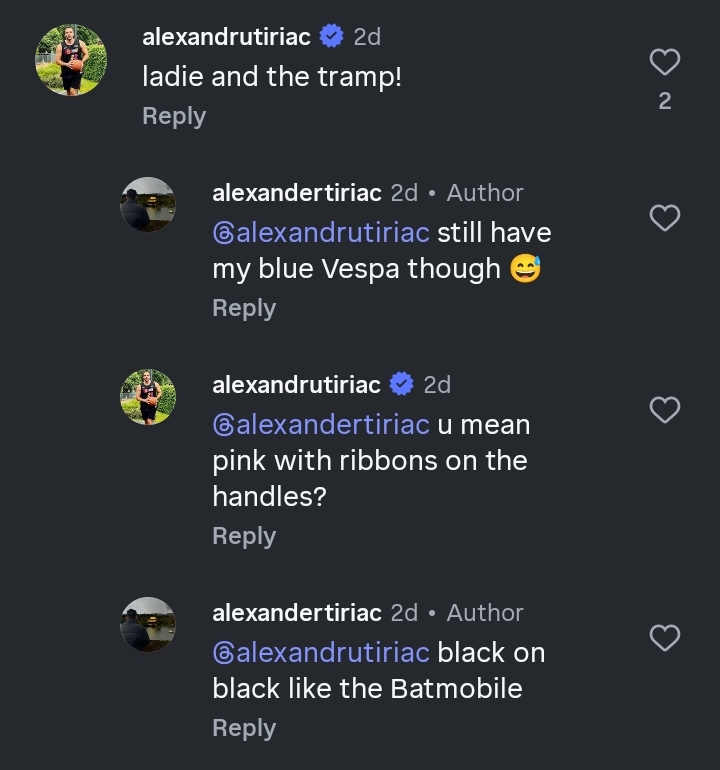 Tatăl lui Alexander, Ion Țiriac Jr. a lăsat un comentariu în cadrul postării cu celebrul titlu de desene animate „Doamna și vagabondul”.