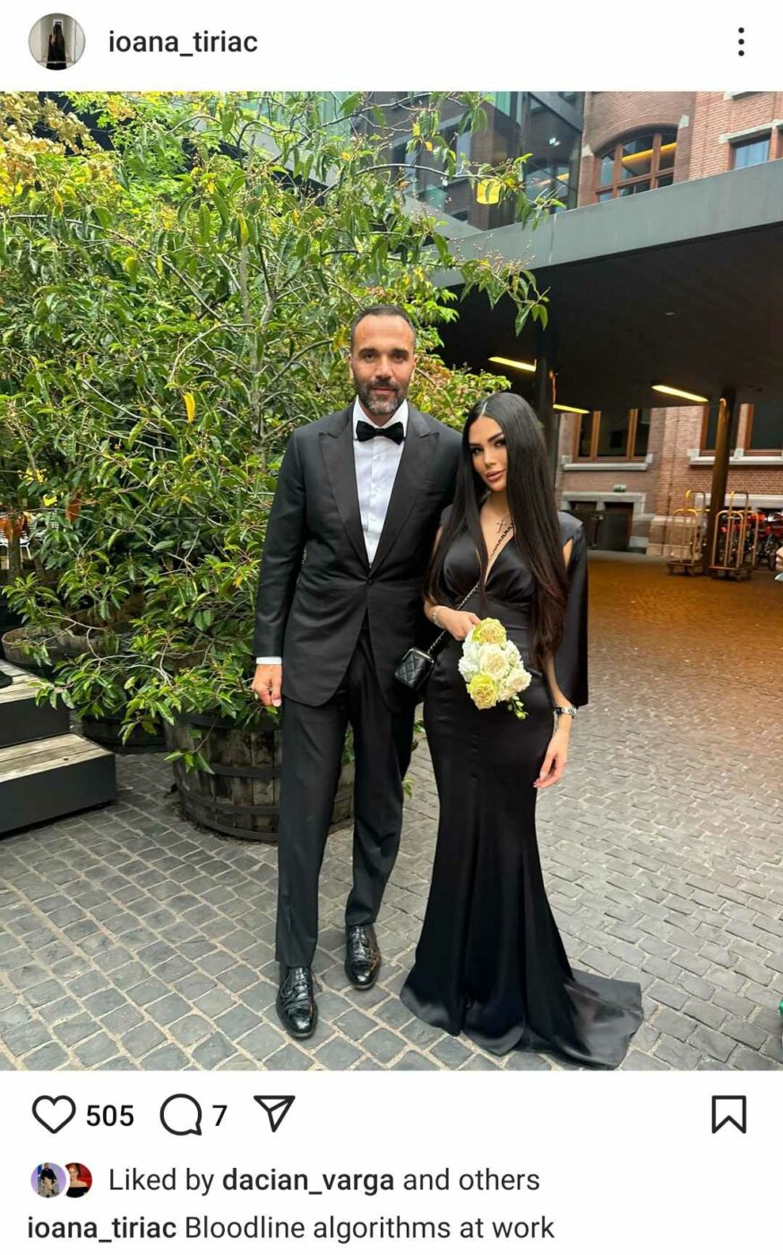 În fotografia respectivă, Ioana și Alexandru Țiriac sunt îmbrăcați elegant, semn că au luat parte la un eveniment important. Ea poartă o rochie lungă, neagră, pe care a accesorizat-o inspirat cu o geantă de aceeași culoare și ține în mână un superb buchet de flori, iar el un costum clasic, cu papion.