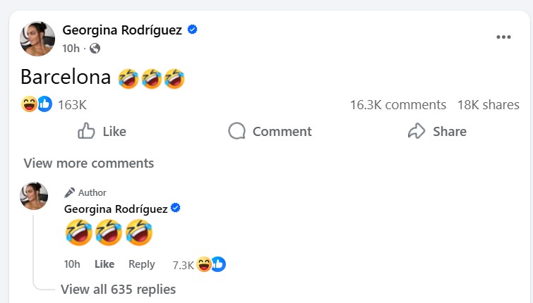 Georgina Rodriguez, iubita lui Cristiano Ronaldo, cel care este o adevărată legendă a celor de la Real Madrid, nu a ratat ocazia și s-a amuzat copios pe seama celor de la FC Barcelona. Aceasta a făcut o postare pe rețelele de socializare, în care a folosit doar un singur cuvânt și un emoticon pentru a-i umili pe catalani. Postarea făcută de Georgina Rodriguez o puteți vedea mai jos.
