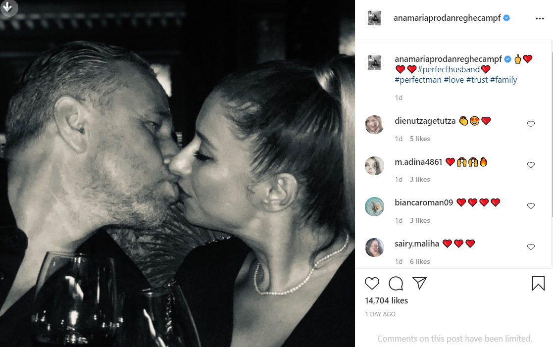 Sexy-impresara se află în aceste momente în Dubai altături de Laurențiu Reghecampf Junior, iar la scurt timp după ce Reghe a fost prezentat oficial la Universitatea Craiova, sexy-impresara a postat o imagine în care apare când îl sărută pe antrenor și a adăugat următorul mesaj: „perfect husband, perfect man, love, trust, family” (n.r. soț perfect, bărbat perfect, iubire, încredere, familie).