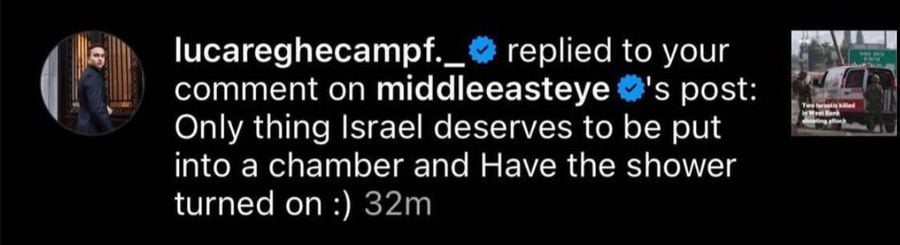 Tragicul eveniment l-a făcut pe Luca Reghecampf să aibă un derapaj antisemit în mediul online. Fiul antrenorului de la Universitatea Craiova a scris pe contul de Instagram, între timp închis, în legătură cu această întâmplare: „Singurul lucru pe care Israelul îl merită este să fie pus într-o cameră şi pornit duşul”.