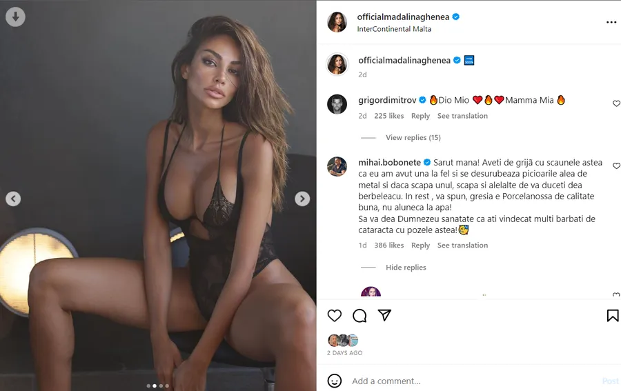 La imaginile postat de Mădălina Ghenea pe contul său de Instagram a reacționat și Grigor Dimitrov, celebrul jucător de tenis din Bulgaria. „Dio Mio! Mamma Mia”, iar răspunsul actriței din România nu s-a lăsat așteptat. „Mamma mia tu”.